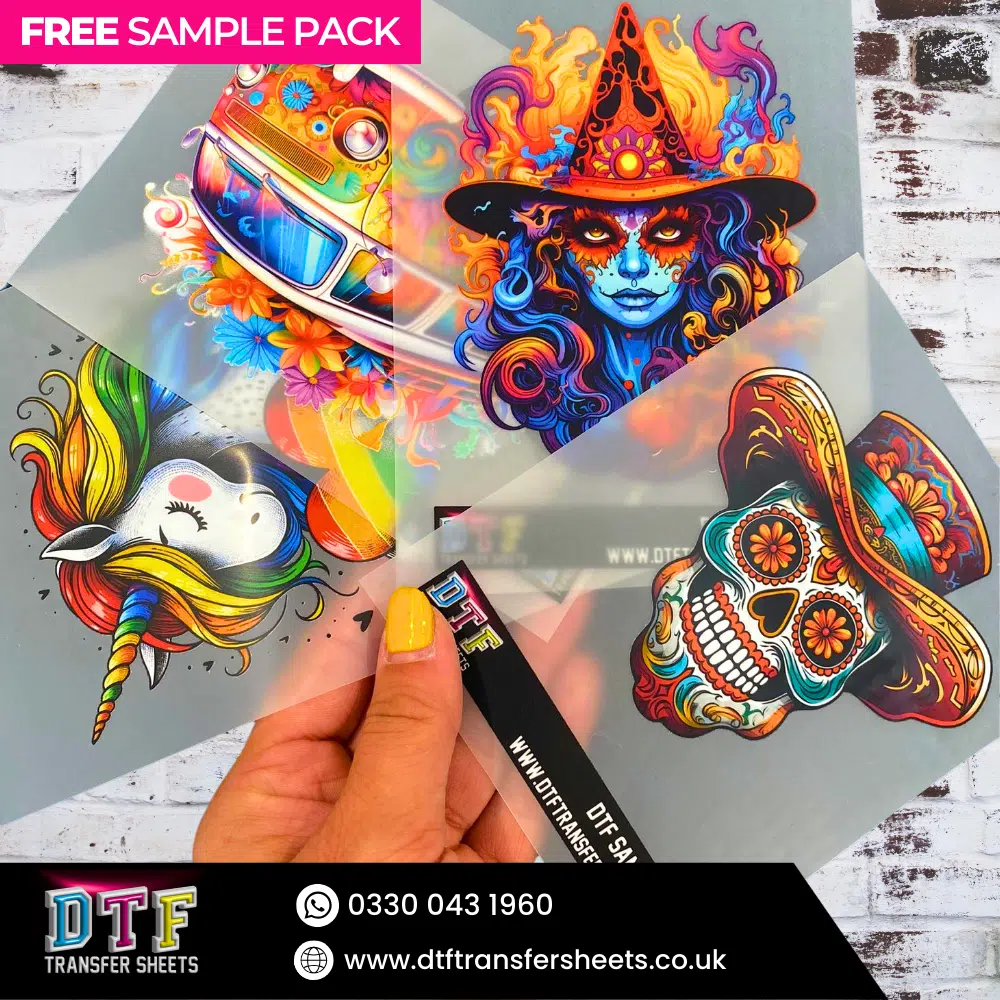 FREE DTF Transfer Sheets Sample Pack – Experience the Quality of Direct-to-Film Transfers Are you curious about the world of Direct-to-Film (DTF) printing but hesitant to commit to a full purchase? We understand that quality matters, and that’s why we’re excited to offer you a FREE DTF Sample Pack! This is your opportunity to explore the exceptional capabilities of DTF transfer sheets without any financial risk—simply cover the shipping costs. Our FREE DTF Sample Pack includes a selection of high-quality DTF transfer sheets, meticulously crafted to deliver vibrant colours, intricate details, and outstanding durability. Whether you’re a seasoned professional or just starting out in the realm of custom apparel and merchandise, these samples will provide you with a first-hand experience of what our DTF technology can achieve.
